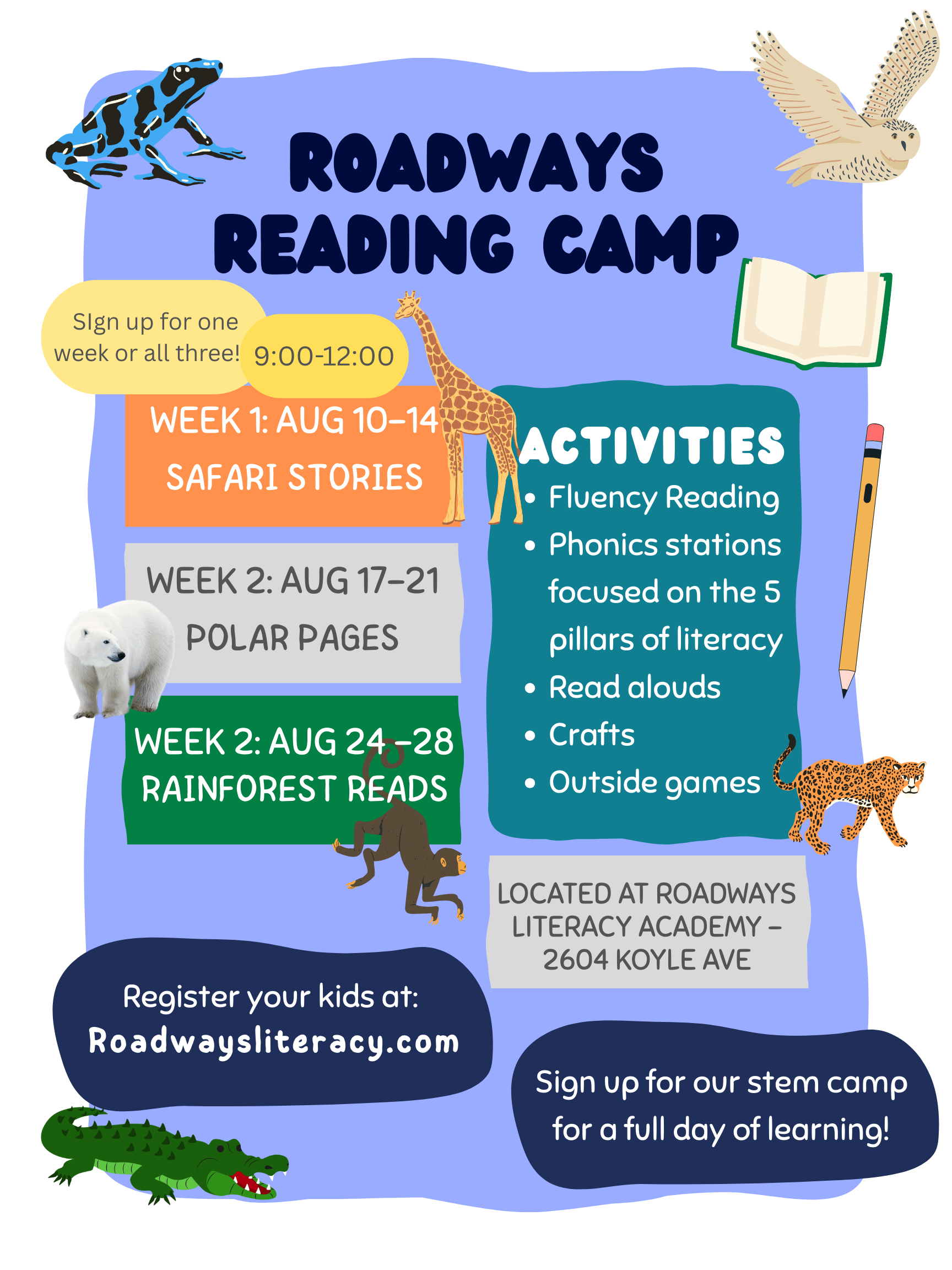 In the mornings, our Literacy Camps will take kids on an exciting trip that will include a safari, a trip to the ice covered north, and to the rainforest! Through engaging reading activities, stories, crafts, games, and themed snacks, campers will explore different areas of our world and the animals who live there.