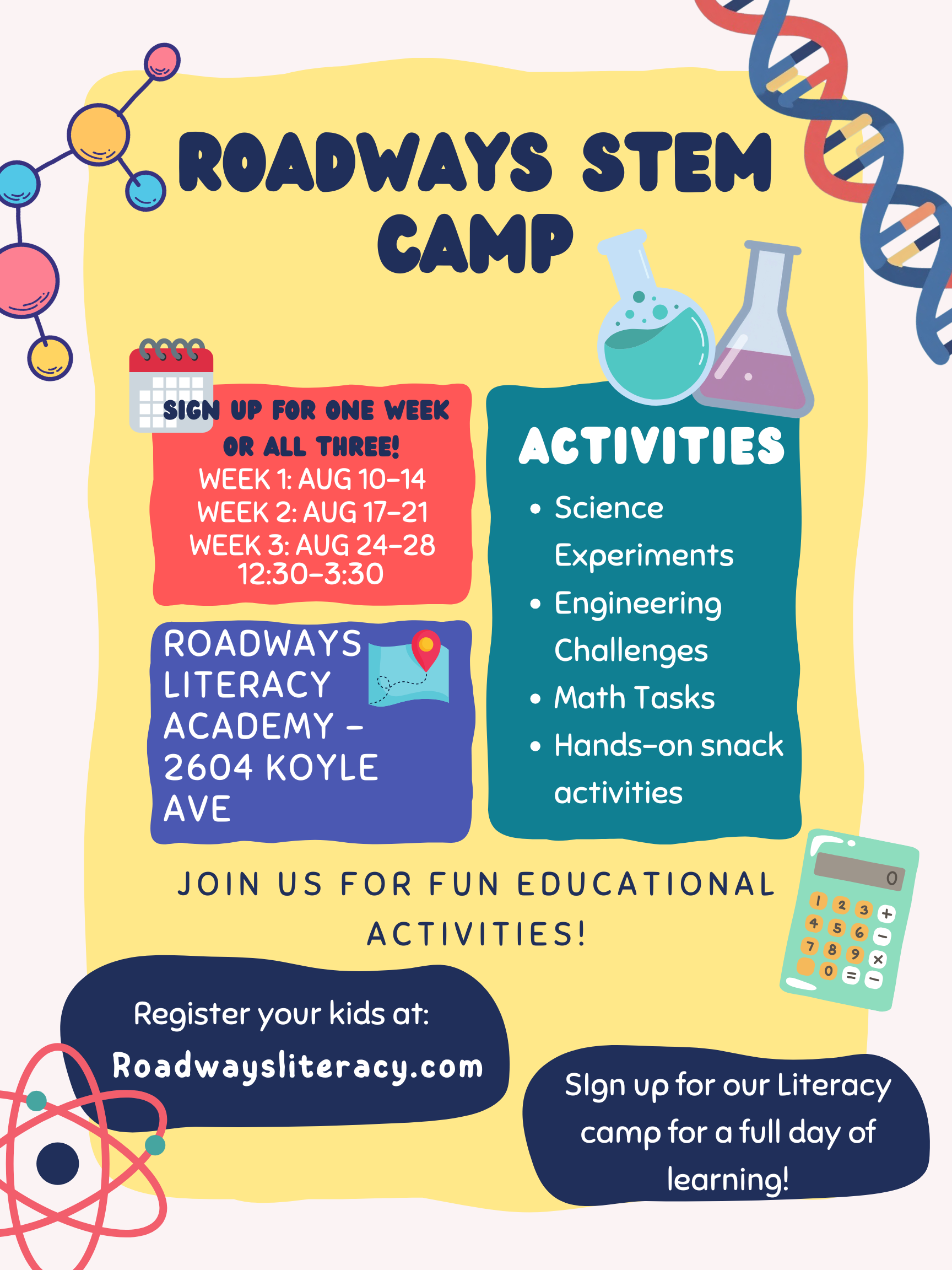 In the afternoons, our STEM camp will spark curiosity with hands-on science and math activities, experiments, and explorations. Click on the posters above to access registration details!